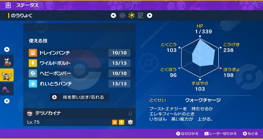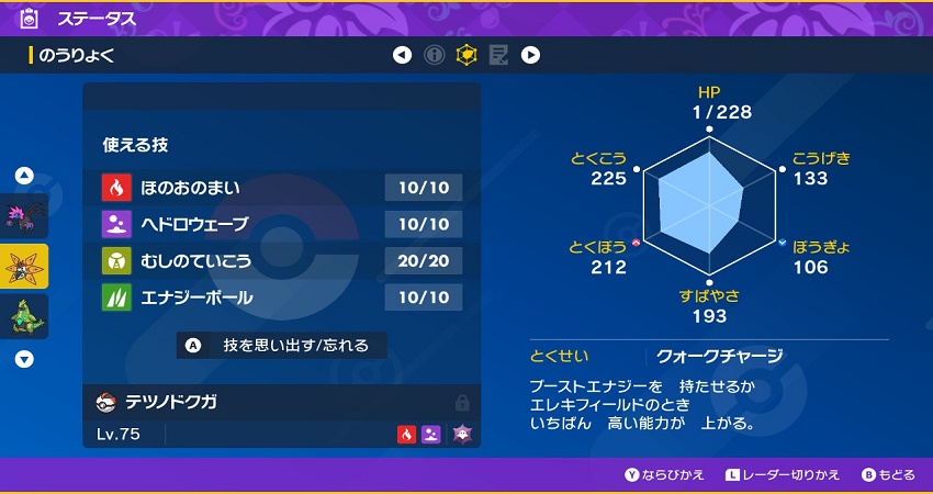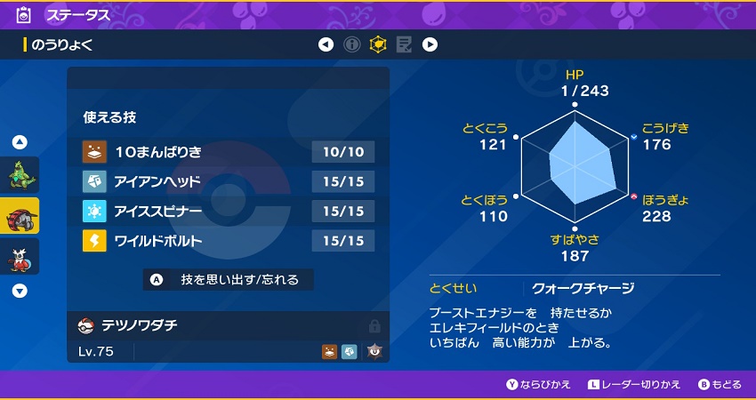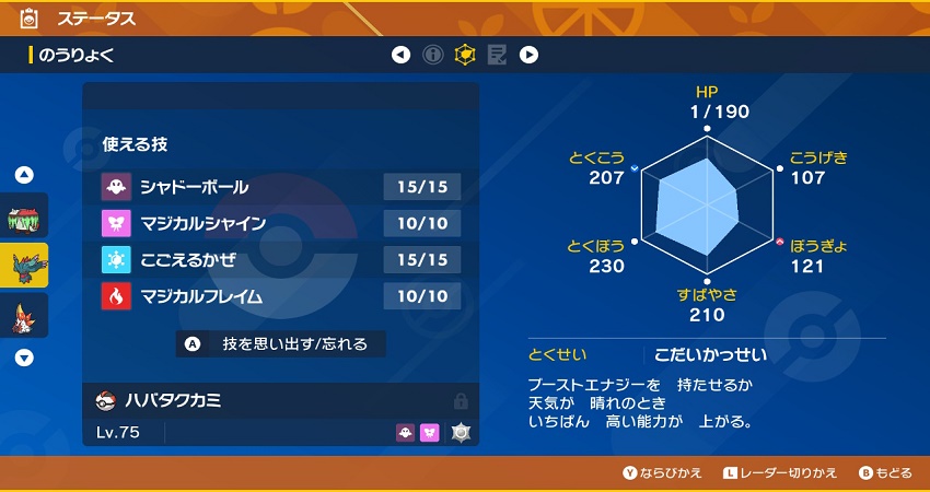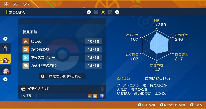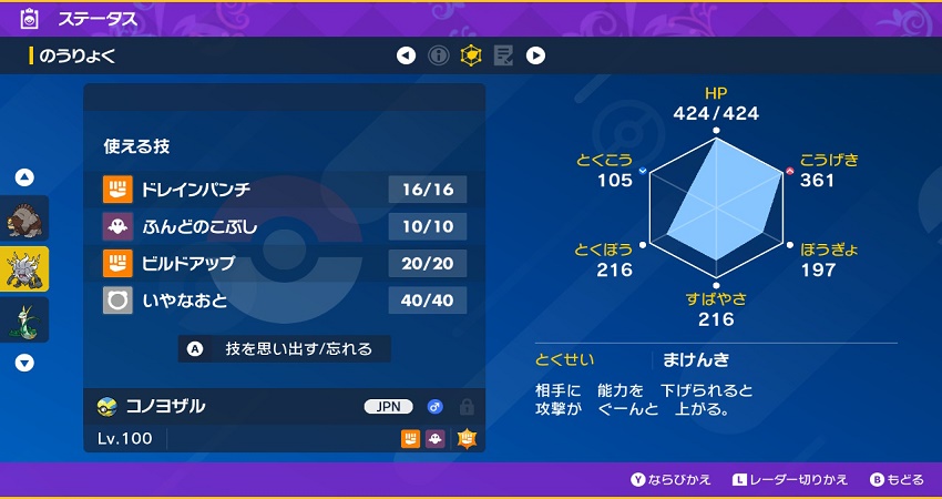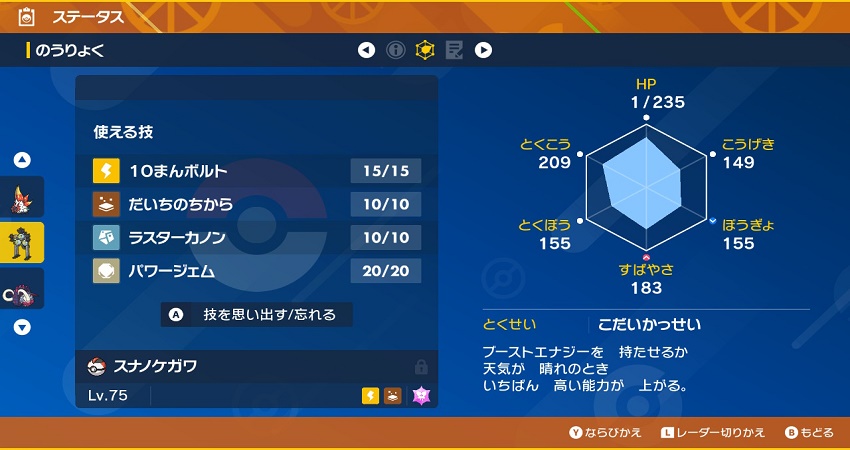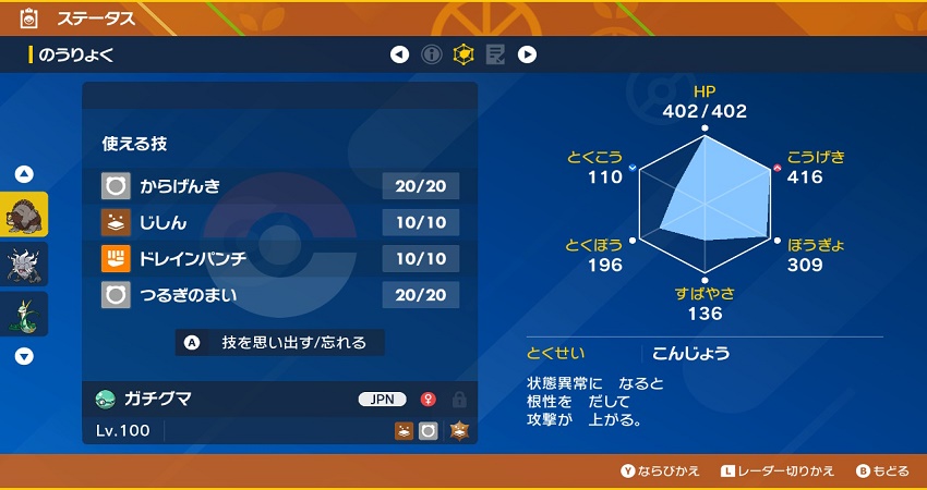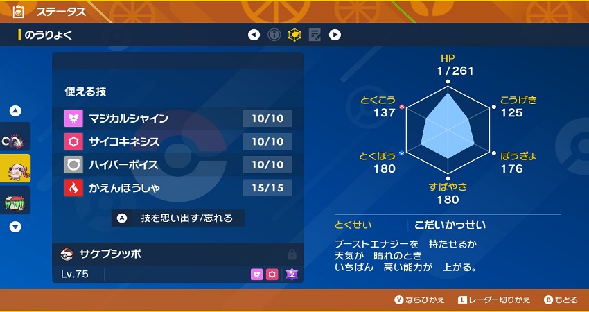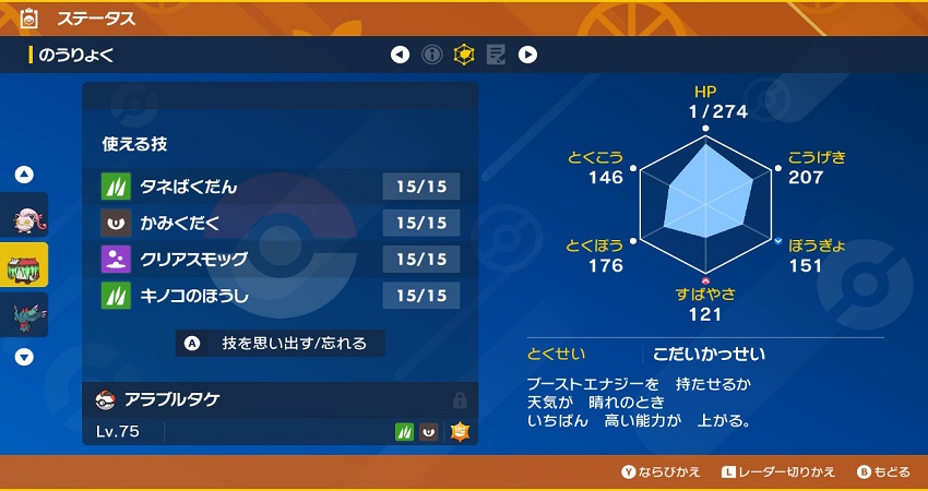 特性はキノコのほうし対策にやるきが使いやすいですが、デバフ技が飛んできやすく発動機会の多いまけんきも面白いです。