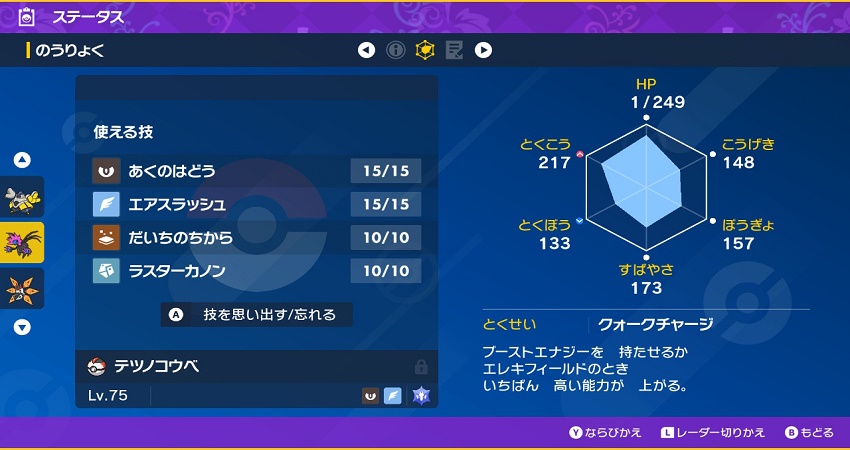 実数値:H249-A148-B157-C211-D148-S190 ※性格補正なし+6Vの場合(Lv75)