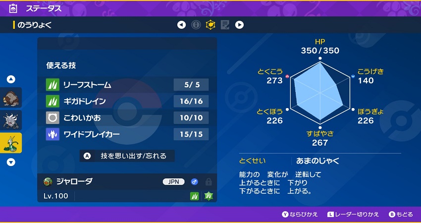 特性あまのじゃく+リーフストームで特攻をグングン上げていきながら大ダメージを叩き出せるので考えなしに突っ込んでも楽々勝利が目指せます。