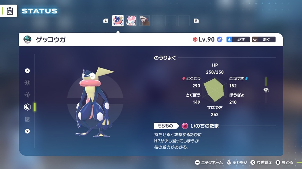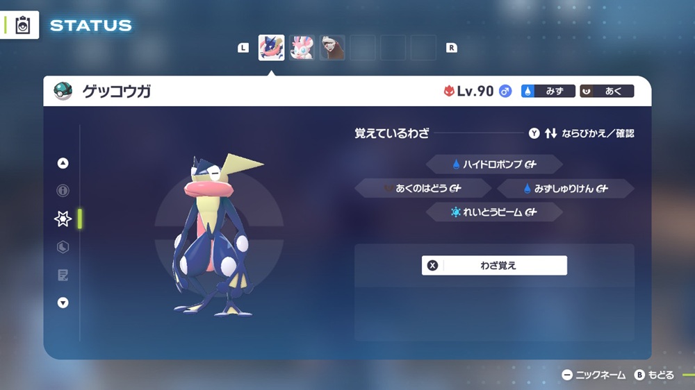 • 技構成:ハイドロポンプ / あくのはどう / れいとうビーム / みずしゅりけん
